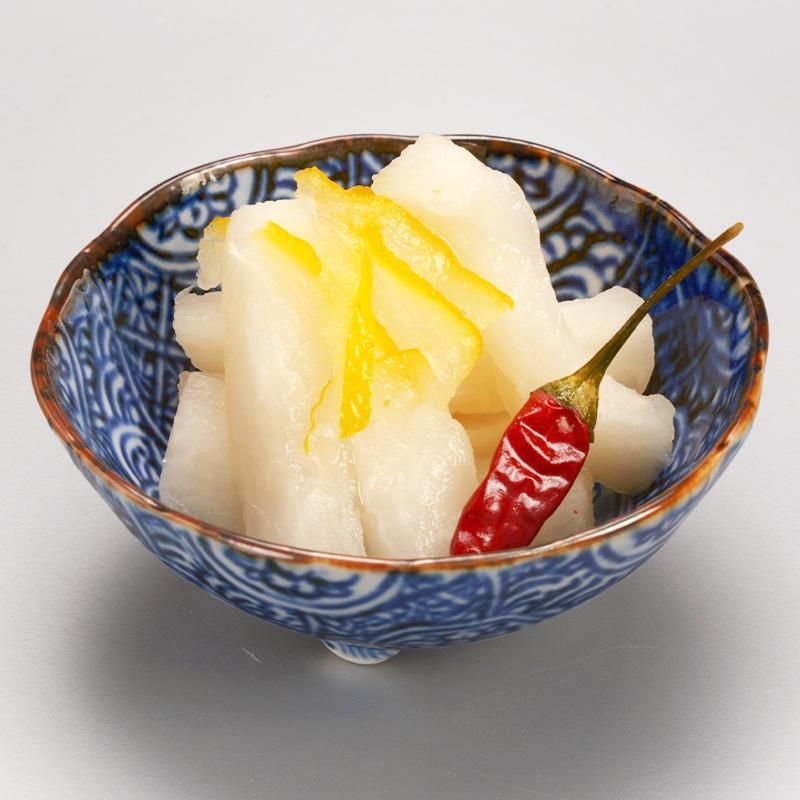 青首大根を拍子木切りにし、手間暇をかけ、下漬(塩漬)2回で余分な水分と灰汁を取り除いた後、本漬で爽やかな風味に仕上げました。「柚子」の香りが豊かで、何度食べても飽きない上品な味わいです。