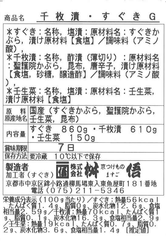 | 内容 | 千枚漬(700g)・すぐき(1050g)・壬生菜(200g) |